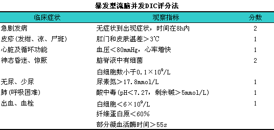 为了早期确诊病儿存在DIC症状,lSutor(1982)报告采取了评分制进行诊断(见下表),l评分在6分以上者可能存在DIC。值得注意的是末梢血白细胞出现不同情况,l当休克型流脑并发DIC时,l末梢白细胞减少。脑脊液中虽然细菌大量可见,l但白细胞并不增加。