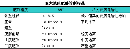 国际肥胖特别工作组于2000年又提出了定义亚洲成年人肥胖的BMI标准(见下表)。
