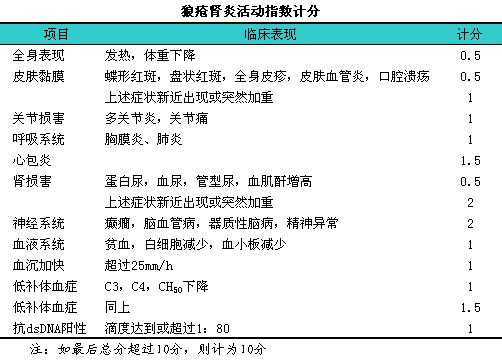 在我国,l不少医院仍未广泛开展肾活检,l而且不少病人拒绝接受肾活检。因此对狼疮肾炎的活动性,l我们提出可试用表来评价,l此表的单项累加总积分即是狼疮肾炎活动指数。如积分大于10分,l则归为10分。这样,l狼疮肾炎的疾病活动性在0分(不活动)至10分(极度活动)之间。这一活动性指数能较简便,l合理有效地测定狼疮肾炎的活动程度,l及时控制发作可明显改善远期预后。