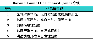 本病的诊断应使用UC的通用诊断标准,l包括临床表现、i结肠镜及活检、iX线钡餐灌肠等改变。不过,l临床表现上根据症状只能臆测病变范围及严重度,l结肠镜检查才具有确定诊断的价值。关于镜型的选择,l过去比较强调直肠镜、i乙状结肠镜和全结肠镜的不同功能,l现在,l由于器械的改进、i技术的普及,l仅用全结肠镜亦可对不同的肠段进行检查,l因此对直肠炎可视检查的目的决定进镜的深度。镜下可见直肠血管的显露、i分支模糊不清;黏膜充血、i水肿呈沙粒样,l反光增强,l直肠瓣粗钝颗粒状,l可能有自发或接触性出血,l严重病例有大小不等的溃疡、i黄白色分泌物附着等。由直肠镜所见可以确定炎症的程度。如Baron等分级如下表。