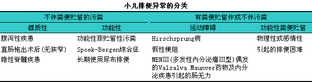 Paul对小儿排便异常进行了系统研究后,l以病理生理为基础对本病分类学进行了探讨。Paul认为排便异常主要分两大类:i不伴粪便贮留的污粪(亦称溢粪),l有粪便贮留时伴有或不伴有污粪(见下表)。