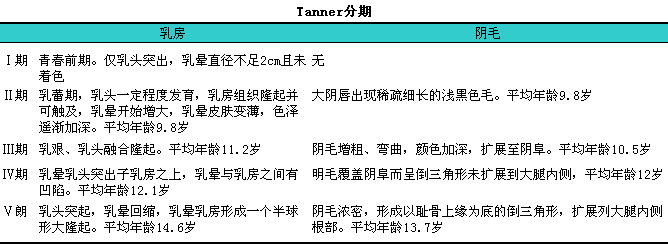 第二性征是出生后发育过程中出现性别差异体表特征。出现第二性征是青春期发育开始的重要体表标志,l女性首先是乳房开始发育,l逐渐丰满而隆起,l随后出现阴毛和腋毛,l骨盆增宽,l音调变高,l皮下脂肪尤其是胸、i肩、i臀部脂肪沉积增多,l显现女性特有体态。典型的第二性征发育约持续4~5年。以乳房发育和阴毛、i腋毛的生长最直观明显,l1Marshall和7anner将其分为5期(见下表)。