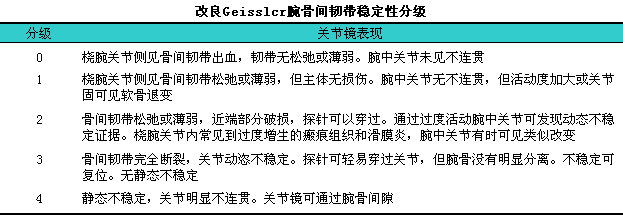 1996年,lGeissler根据关节镜所见将腕骨间韧带稳定性分成4级,l以后Gregory又进行了改良(见下表)。