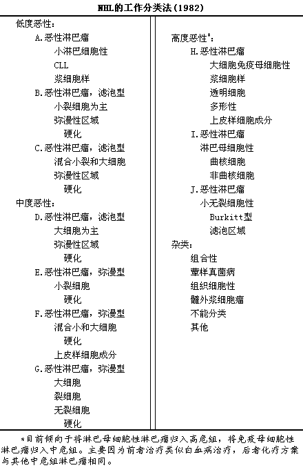 20世纪80年代初,l美国国立癌症研究所(NCI)组织了来自4个研究所的专家对l200例淋巴癌资料进行评估分析,l结果表明6种淋巴瘤分类的任何一个分类对存活率预测和重复性能显示出明显的优点,l故于l982年提出了NHL的工作分类法(见下表)。