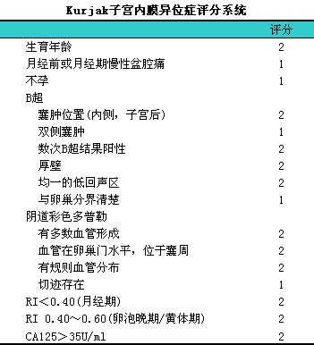 Kurjak等最近一项5年的回顾性研究中,l将临床症状、i体征、i血清CAl25、iB超和阴道彩色多普勒超声结合形成一评分系统(见下表),l由于微小和轻度子宫内膜异位症病变在盆腔超声下无法发现,l因此,l腹膜种植异位灶未列入该表中。彩色超声多普勒发现子宫内膜异位症的患者血流阻力指数(resistant1index,lRI)随月经周期改变而变化,l经期RI降低,l非经期增高,l有异位瘤的患者可发现子宫肌层内的小动脉切迹。诊断子宫内膜异位症的判断标准范围在20~25分。