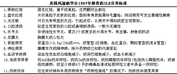 目前普遍采用美国风湿病学会(ACR)1997年推荐的SLE分类标准(见下表)。该分类标准的11项中,l符合4项或4项以上者,l在除外感染、i肿瘤和其他结缔组织病后,l可诊断SLE。其敏感性和特异性分别为95%和85%。需强调指出的是,l患者病情的初始或许不具备分类标准中的4条,l随着病情的进展方出现其他项目的表现。11条分类标准中,l免疫学异常和高滴度抗核抗体更具有诊断意义。一旦患者免疫学异常,l即使临床诊断不够条件,l也应密切随访,l以便尽早做出诊断和及时治疗。