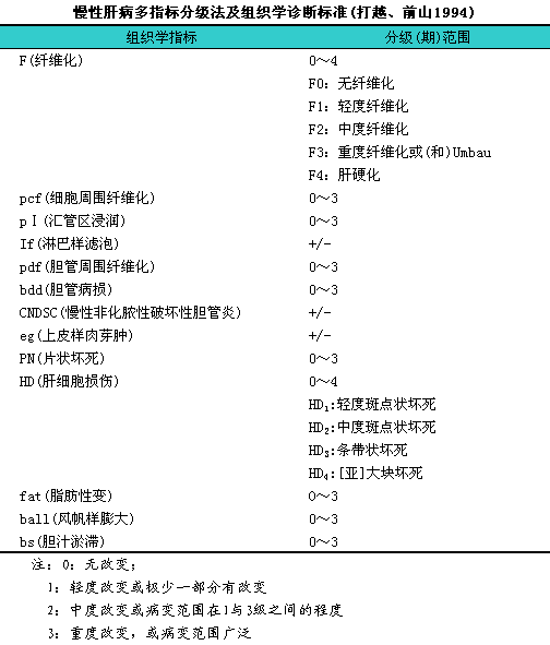 由于新的分类法限定病因只为病毒,l打越、i前山(1994)提出还包括自身免疫性肝炎,l酒精、i药物性以及其他未明病因性慢性肝损伤的多指标分级法,l以解决缺乏特征性病理改变的鉴别如下表所示。