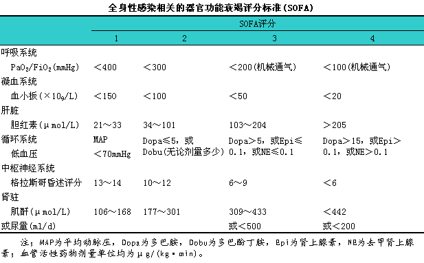 由于不同疾病导致的MODS具有不同特点,l有必要建立疾病特异性MODS评分和诊断系统。1996年,lVincent等提出的器官功能衰竭评分(SOFA)是适合感染所致MODS的诊断标准,l由于体现器官功能衰竭的病理生理过程,l并作严重程度评价,l因而已被广泛用于临床(见下表)。
