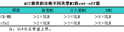 2000年4月,lESC和ACC共同通过了MI的最新诊断标准。最新诊断标准强调了心肌损伤,l生化标志物的作用。标准规定:i当cTnI和CK-MB出现典型的MI变化时,l只要满足下列四项中的任何一项,l就可诊断为MI:i①缺斑症状。②病理性Q波。③ST段升高或降低。④最近有介入治疗史。新的诊断标准虽然强调了cTnI和CK-MB的作用,l但并未提出具体的cut-off值。而是要求各个实验室,l建立各自的cut-off值。ACC在这方面则提出了具体的标准(见下表):i当CK-MB或cTnl大于正常参考值上限的5倍时,l就可考虑PMI的诊断。