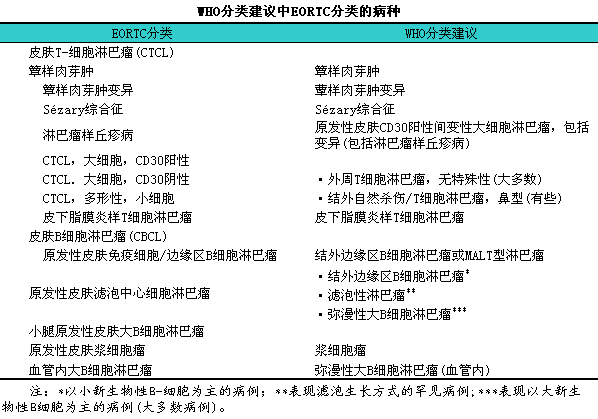 欧洲癌症研究和治疗组(European1organization1for1research1and1treatment,lEORTC)关于原发性皮肤恶性淋巴瘤的分类,l见下表。