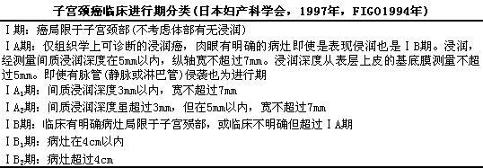 1997年,l日本子宫癌研究会对子宫颈癌的临床进行期分类进行了修改,l鳞状上皮癌的ⅠA期又细分为ⅠA1期与ⅠA2期(腺癌仅有ⅠA期),l新ⅠA1期中包括旧分类ⅠA期93.5%,lIB期的8.3%,l新1ⅠA2期相当于旧ⅠB期的22.8%,l将旧分类的患者按新分类法分类后,l对其治疗方法有给予再研究的必要。