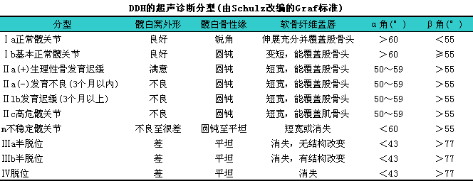 本组应用由Schuh改编的Graf标准作为诊断分型标准(见下表)。超声仪器自带软件可以计算出α角与β角。