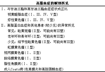 游离脂肪酸等血脂成分单独或几项同时增高。Vinger(1970)等介绍高脂血症的眼部所见(见下表)。