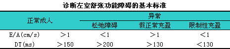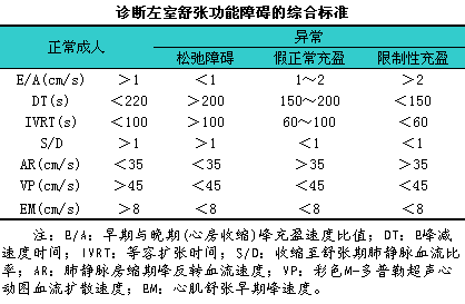 (6)多普勒超声心动图检查:i①左室收缩功能参数正常。②a.诊断左室舒张功能障碍的基本标准见下表。b.诊断左室舒张功能障碍的综合标准见下表。