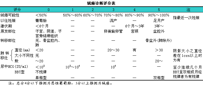 2.临床侵蚀性及转移性葡萄胎(clinical1invasire1mole1and1metasatic1mole)11指临床上发现病灶,l根据绒癌诊断评分(见下表)认为侵蚀性葡萄胎或持续存在葡萄胎转移灶者。