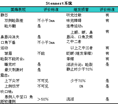 Stennert于1977年报道了双重评价系统(见下表)。他简单地将每一评价指标以是或不是表示,l并分了原发面瘫与继发损害两方面去评价。在原发面瘫中又分动、i静态两部分,l前者占60%,l后者占40%,l如分区表示则前额区为10%、i眼区40%、i口区为50%。以“+”代表“是”,l以“-”代表“不是”,l最终将所有“+”乘以10换为百分比即为面瘫指数(FPT)或继发损害恢复指数(SDRI),l其优点在于提高了统一性和可重复性。