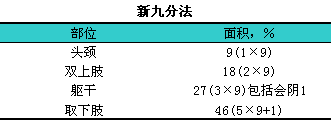 头、i颈面积共9%(其中颈部前后侧各占1%)。双上肢面积共18%(其中前后侧上臂各2%,l前臂各1.5%,l手的掌面、i背面各1%)。躯干面积共27%(其中前后侧各13%、i会阴1%)。臀部面积共5%。双下肢面积共41%(其中前后侧大腿各5%,l小腿各3.5%,l足背、i跖面各1.75%),l见下表。