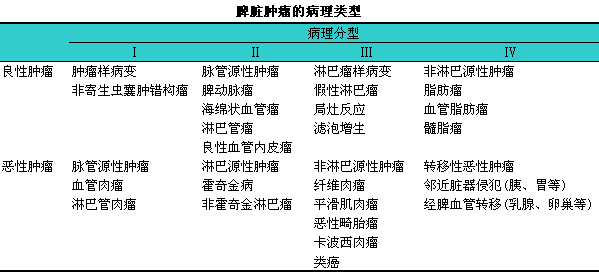 (4)转移性肿瘤:i包括全身性疾病或其他脏器的恶性肿瘤,l有直接非转移性侵犯和经脾动脉侵入两种方式,l如白血病、i胰腺癌、i卵巢癌等。脾脏肿瘤的病理类型分四型(见下表)。