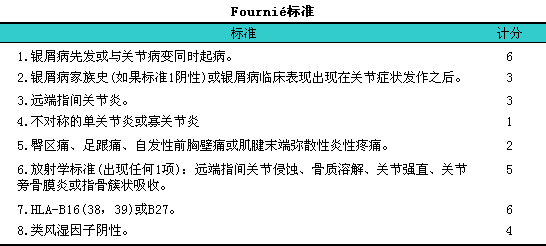 Fournié标准首次将遗传学检查纳入诊断标准,l该标准对诊断PsA的敏感性为95%,l特异性为98%。在此标准中,l确诊PsA需要计分达11分以上。值得注意的是携带HLA-B16/B17基因、i类风湿因子阴性及有银屑病家族史的患者,l即使缺少银屑病或关节炎也可做出PsA诊断。