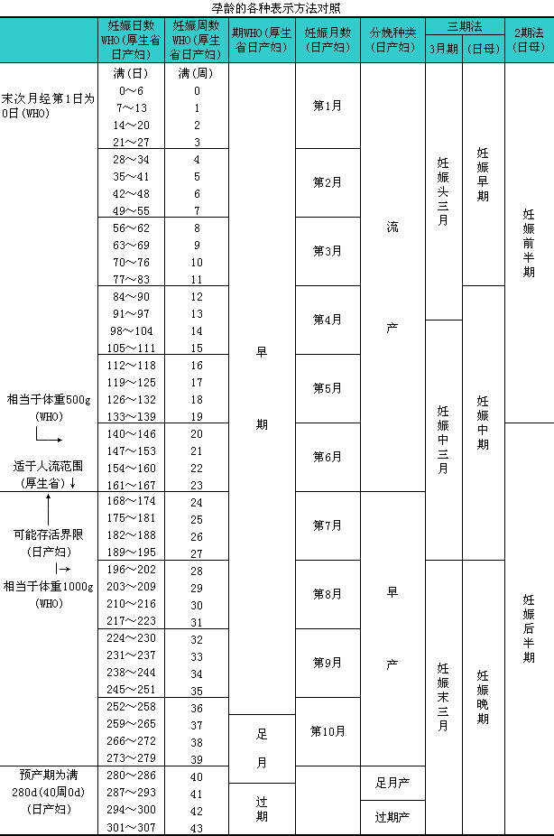 日本的分期法是将妊娠第2~10的9个月分为3等份;而三月期的分期法是将妊娠期的42周(294天)分为3等份,l两者均无特别严格的产科学意义。例如若考虑是否易于发生自然流产或行人工流产术难易的时期,l则在妊娠11~12周划分界限,l称妊娠12周以后的人工流产为中期引产,l即根据此种观点。日母采用妊娠19周以前(至妊娠5个月)称妊娠前半期技E娠20周以后(妊娠6个月以后)称妊娠后半期的2期表示法。