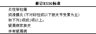 欧洲脊柱关节病研究组提出的修订ESSG标准(见下表):