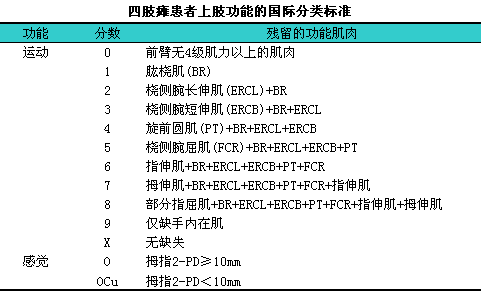 按国际截瘫医学会(International1Medical1Society1of1Paraplegia,lIMSOP)1984年制定的标准进行评级(见下表)。“功能肌肉”系手法检查该肌肉,l肌力在4级或4级以上者。感觉仅检查拇指指腹的静态两点辨别觉(2-PD,lWeber法)。O代表仅有视觉功能,l病人仅能依靠视力控制手的活动;OCu代表兼有视觉与拇指指腹皮肤感觉,l关节位置觉良好,l可帮助控制手的活动。