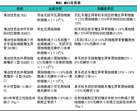 以往用FAB分类法,l自2001年以来,l全世界已用WH0分类作为成人MDS的分类标准(见表5-7),l与FAB分类不同点主要在于:i①将确诊转为急性白血病的骨髓中最低原始细胞值从30%减为20%,l从而去除了FAB分类中难治性贫血伴原始细胞增多向白血病过渡型(RAEB-T);②将低危型难治性贫血(RA)及难治性贫血伴环状铁粒幼红细胞增多(RARS)分为5种不同亚型,l主要依据是单系或多系受累,l是否存在孤立性问质性5q染色体伴缺失;③根据外周血及骨髓中原始细胞数多少而将难治性贫血伴原始细胞增多(RAEB)再分为2个亚类;④将慢性髓性单核细胞性白血病从MDS中分出来,l而列为新的一组骨髓增生异常/骨髓增殖性疾病(MDS/MPD)。
