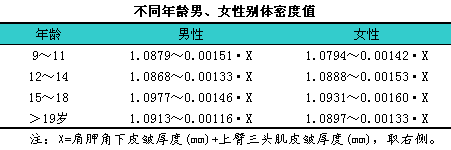(3)脂肪百分率(F%)测定:i判断肥胖与否单凭测体重是不够确切,l主要看脂肪在全身的比例(见下表标准),l可按下列公式计算:iF%=(0.570/D-4.142)×100。其中体密度(D)依照下表测算,l然后代人公式内。