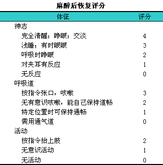 1.一般情况:i神志清楚。定向能力恢复,l能辨认时间和地点,l能接受指令性动作。肌张力恢复接近正常,l平卧抬头能持续5s以上。无急性麻醉或手术并发症,l如呼吸道水肿、i神经损伤、i内出血、i恶心和呕吐等。