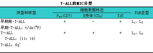 T-ALL分早期前-B-ALL和T-ALL2型,l两型均对CD7+和TDT+,l并伴有非随机性的染色体变化,lT-ALL也对T11+/T16+(见下表)。