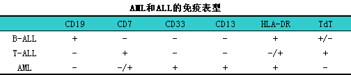用多种抗淋和抗粒系单克隆抗体(McAb)可区分90%~99%的AML和ALL。CD19(B4)和抗HLA-DR1McAb可识别全部B细胞(不识别T细胞),lCD7(WT1/Leu9)可识别全部T细胞(与B细胞无反应),l可用于区分T-ALL和B-ALL。末端脱氧核苷酸转移酶(TdT)可表达在除B-ALL外的全部ALL(极少数AML阳性),l而My9可表达在85%的AML病人,l故可用于区分AML和ALL(见下表)。