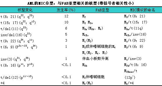 随着细胞遗传学技术的不断发展,l急性白血病病人,l尤其是AML病人染色体变化的诊断和预后意义已更为明确。据目前的资料,lALL约66%有特异性染色体变化。在有染色体畸变的AML中约60%有特异性染色体变化。MIC协作组将AML特异的染色体变化分为10个亚型(见下表)。