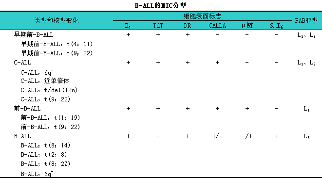 与AML相比,lALL的免疫分型进展迅速,l它不但能对ALL做出精确诊断并能根据不同阶段细胞分化抗原的表达将其分为T-ALL和B-ALL2型。B-ALL又再分为4型,l4型均对DR+、iB4+(见表5-21)。早期前-B-ALL有免疫球蛋白(Ig)基因重排;C-ALL对CD10+(CAL-LA+);前-B-ALL对胞浆内Cu重链(μ+)+;B-ALL以SmIg+为特征。4型中C-ALL最多,lL3型与B-ALL明显相关,lL1和L2型无相关的免疫表型,l但4种免疫学亚型均伴相应的症状和预后特征及非随机性的染色体变化。