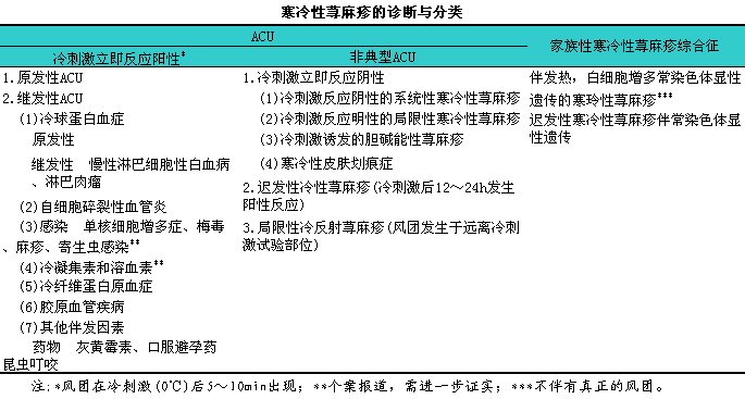 寒冷性荨麻疹的确切病因仍不明了,l一般将其分为以下3类:i①原发性获得性寒冷性荨麻疹(原发性ACU),l此类最为常见;②继发性获得性寒冷性荨麻疹(继发性ACU),l是指伴有冷球蛋白、i冷纤维蛋白原、i冷溶血素、i冷凝集素的寒冷性荨麻疹;③家族性寒冷性荨麻疹,l该病是一常染色体显性遗传性疾病,l家族成员中对冷刺激既可有即发反应也可有迟发反应,l此类罕见。除上述3类外,l有人还提出非典型ACU,l该类也表现为遇寒冷后出现风团和(或)血管性水肿,l以及偶见的低血压,l但与原发及继发性ACU不同,l冷刺激试验立即反应阴性,l此类疾患对冷刺激呈非典型反应和表现为迟发性寒冷性荨麻疹、i寒冷依赖性胆碱能性荨麻疹、i寒冷依赖性皮肤划痕症、i局限性冷反射性荨麻疹(该型冷刺激试验阴性),l以及最为严重的系统性寒冷性荨麻疹。所有非典型ACU的共同特征是风团样皮损不能通过冷刺激立即反应所诱发,l而是通过其他如运动、i压力以及不同温度阈来诱发。Wanderen等提出的分类见下表。