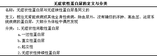 无症状性蛋白尿大部分是偶然发现的,l可分为无症状性间歇性蛋白尿与无症状性持续性蛋白尿,l前者又分为一过性与体位性(直立性)(见下表)。其中的无症状性间歇性蛋白尿并不具有病理意义,l肾脏疾病本身就是缺乏自觉症状的疾病,l从慢性肾炎发展至肾功衰竭才有可能出现包括各种病情的严重疾病。这就意昧着无症状性蛋白尿的鉴别诊断是很重要的。