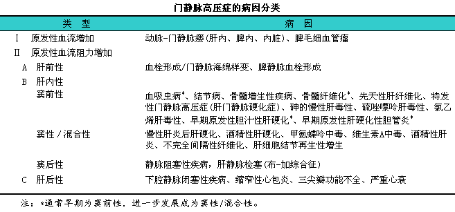 Bass1and1Sombery门静脉高压症发病机制主要是门静脉血流阻力增加和血流量增加所致,l即后向性血流学说与前向性血流学说。前者认为:i门静脉高压是因肝前、i肝内或肝后“梗阻”引起门脉阻力增加,l导致门静脉系统血流被动“淤血”,l后一学说的建立归功于放射性微球技术应用于门静脉高压症的实验研究,l该技术首先准确地测出门脉回流系统各分支器官血流量,l门脉侧支分流量。结果表明门脉流入总量增加,l只不过相当一部分(约90%)经侧支流人到体循环。研究还证明:i肝硬化时,l门脉血流阻力增加是产生PHT的首发因素,l其血管阻力增加主要部位在肝的微循环(肝窦),l同时侧支循环阻力对门脉总阻力及压力增加亦有很大影响。门脉血流增加的原因可以是肝内或肝外的血管因素。肝硬化时主要是门脉血流系统的内脏器官小动脉明显扩张及体液因素导致,l它是维持中晚期肝硬化PHT的重要附加因素。鉴于此,l引用Bass1and1Sombery等提出的分类方法,l见下表。