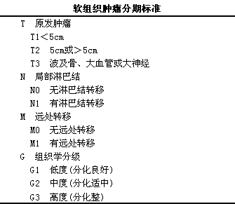 软组织肿瘤的外科分期是另一体系,l是按美国肿瘤联合委员会(American1Joint1Committee,lAJC)系统建立TNMG分期。T是指原发肿瘤的大小,lN是指有无淋巴结转移,lM是指有无远处转移,lG是指组织学分级(见下表)。按表11-6的分析,l可确定软组织肿瘤的TNMG分期,l确定治疗方案。