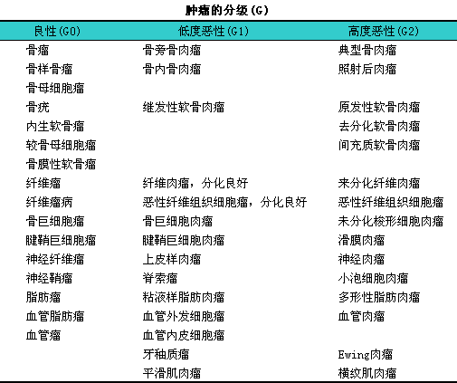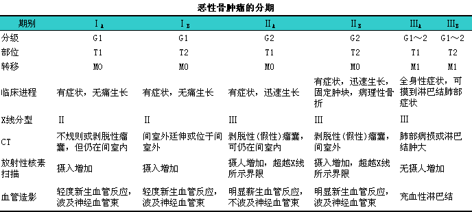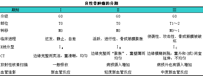 除上面所说的分级、i部位和转移外,l尚需参阅临床进程、iX线分型、iCT、i放射性核素骨扫描和血管造影(图11-1、i2,l见下表)。如此不但能区分良恶性肿瘤,l还可进行外科分期。根据分期可确定合适的手术治疗方法。