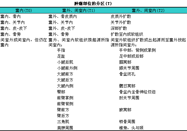 2.部位(T):i是指肿瘤侵袭范围,l以肿瘤囊和间室为分界。T0为囊内;T1为囊外但仍在问室内;T2为囊外和间室外(见下表)。