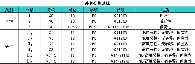 自1977年Enneking提出外科分期来评估骨肿瘤的治疗以来,l它已被广泛应用,l可在术前制定治疗措施,l使手术方案有了科学依据。10年来的临床实践证实,l这种外科分期是切合实际的。外科分期是将外科分级(G)、i外科区域(T)和区域性或远处转移(M)结合起来,l并以此制订手术方案。根据手术、i化疗、i放疗等综合措施,l最近对外科分级又有所改进。