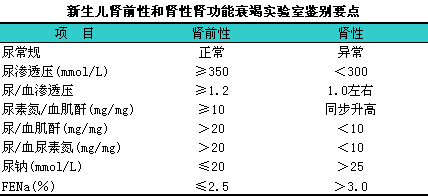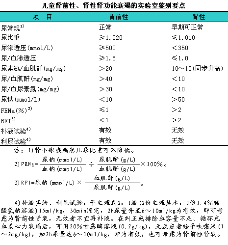 3.常伴有酸中毒、i水电解质紊乱、i心力衰竭、i悊厥、i拒奶、i吐奶等表现;若无尿量减少者,l则诊断为非少尿性急性肾功能衰竭。肾前性、i肾性肾功能衰竭(急性肾小管协死)的实验室鉴别参数见下表。