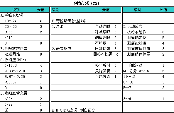 Jacobs等指出:iTS为14~16者,l生理变化小,l存活率高(96%);1~3者,l生理变化很大,l死亡率高(>96%);4~13者,l生理变化明显,l救治效果显著。文献资料中常以TS<12为重伤标准;TS的灵敏度为63%~85%,l特异度为75%~99%,l准确度为98.7%。