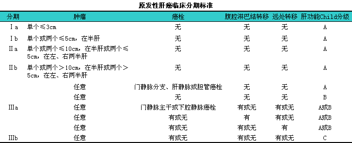 Ⅲa11肿瘤情况不论,l有门静脉主干或下腔静脉癌栓、i腹腔淋巴结或远处转移之一;肝功能分级Child1A或B。