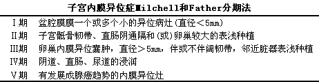 1974年,lMitchell和Farber根据内膜异位症与恶性肿瘤的相似性提出外科分期法(见下表)。实际上。按这种分期方法的第Ⅴ期即为可能发展成腺癌的内膜病变。按分期决定是药物还是手术治疗。他们主张对Ⅰ、iⅡ期患者应用孕激素治疗解除疼痛。对于其中不孕患者,l可手术分解粘连、i切除异位病灶,l保守性手术后的妊娠率是32%。Mitchell和Fsrber认为对Ⅳ、iⅤ期患者应行手术探查,l排除卵巢恶性肿瘤。广泛内膜异位的患者应切除子宫和双侧附件。