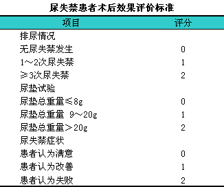Grouts—Blaivas评分法评价手术治疗效果标准见下表。3项相加总分等于0为治愈,l1~2分为改善良好,l3~4分改善中等,l5分改善较差,l6分为失败。