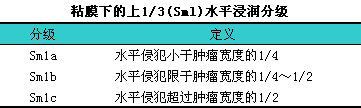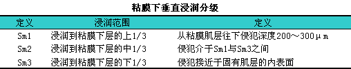 2.粘膜下浸润:iHaggitt等将早期大肠息肉样癌分为有蒂与广基型,l并将粘膜下侵犯分为五种类级:i①0级:i无浸润的原位癌。②1级:i粘膜下浸润但只限于息肉的头部。③2级:i浸润扩展到息肉的茎部。④3级:i浸润到息肉蒂或基底部的任何部位。⑤4级:i浸润超过蒂或基底部,l但未及固有肌层。这一分类一直广泛用于评价结肠镜息肉切除标本切除的足够性,l但不适用于无蒂的平坦型病变。日本学者已将粘膜下侵犯根据垂直浸润与水平浸润加以分类(见下表),l这些更适合于大的平坦型病变。垂直分类将粘膜下浸润分成上(Sm1)、i中(Sm2)和下(Sm3)1/3浸润(见下表)。根据粘膜下侵犯相当于多少肿瘤宽度,l将Sm1水平分类为Sm1a、iSm1b、i1Sm1c三型(见下表)。
