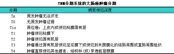 自1932年,l大肠癌侵犯深度一直用Dukes分类,l但1Dukes1A1期既包括早期大肠癌,l亦包括所有限于肠壁的癌。最近更倾向于TNM分类(见下表),l因为它更符合当今大肠癌研究。