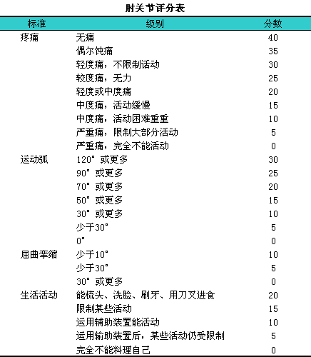 手术前后使用肘关节评分表对照评估所有的手术关节(见下表)。