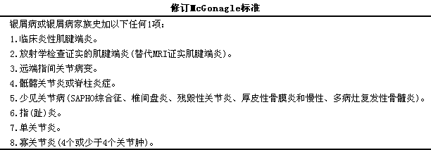 在McGonagle标准中提出应用肌腱末端病定义PsA,l其中肌腱末端病需用磁共振成像(MRI)检查确定,l由于MRI不适合流行病学的研究,l因而在修订的标准中,l采用普通放射学检查来替代MRI,l使之更为实用。