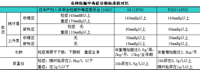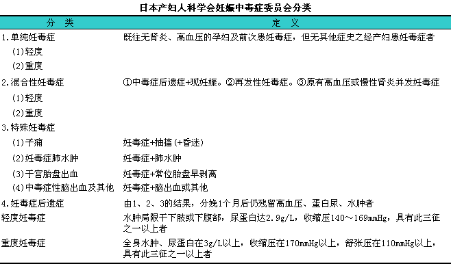 日本近年来仍沿用1962年产妇人科学会妊娠中毒症委员会所提出的分类法,l详见下表。该分类对3大症状的下限值无明确规定,l已不适应当前国际趋势。最近世界妇产科联合组织(FIGO)拟定的分类中,l对水肿以体重增加为标准,l对舒张压也明确规定。各种分类法的对比见下表。